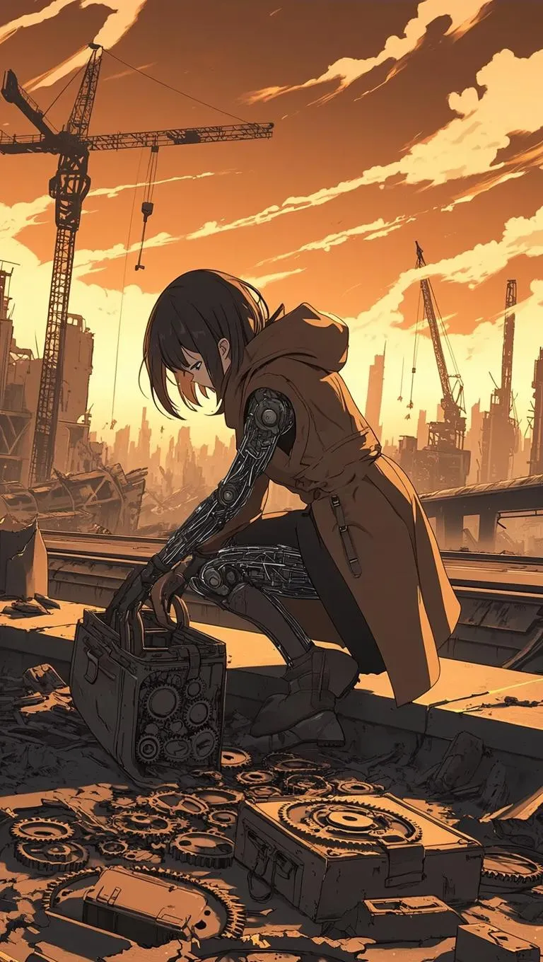 Create cinematic anime art with AI: post-apocalyptic mechanic girl salvaging android parts amid rusted ruins. Watercolor textures blend with high-contrast sepia tones, golden rustlight, and dynamic wind effects. Perfect for desolate yet heroic AI-generated scenes. Elevate your storytelling through Vivago.ai's curated anime-style visuals and atmospheric worldbuilding tools.
