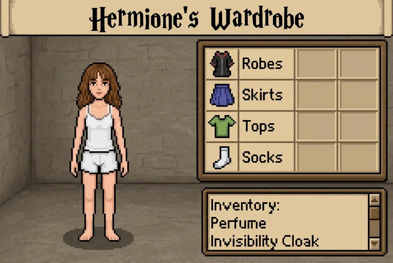 Customize Hermione Granger in Witch Trainer Silver! Explore her wardrobe menu with slots for Robes, Skirts, Tops, Socks. View inventory items like Perfume and Invisibility Cloak. AI transforms this character customization screen into unique visuals. Create your own Hermione scenes effortlessly.