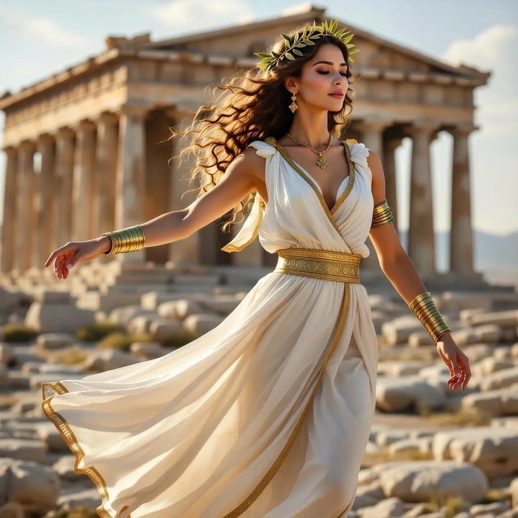 Create a majestic AI-generated cinematic scene of an ancient Greek woman dancing at Athena's Temple of Acropolis. Featuring flowing white-gold robes, olive leaf crown, and intricate details, this AI image offers soft shadows, warm tones, and depth of field for a historical epic film vibe. Elevate visuals with vivago.ai's professional AI creativity tools.