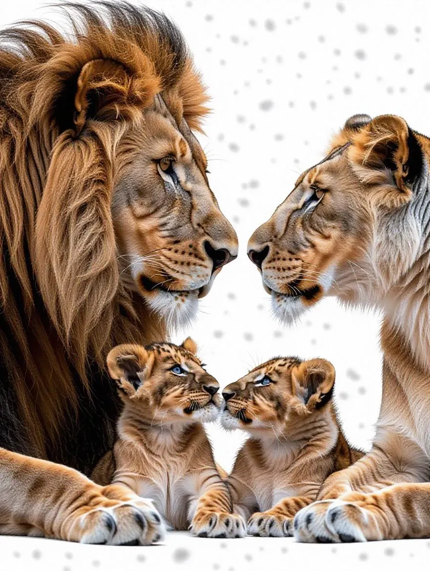 Create a stunning AI-generated scene of a majestic male lion with a flowing mane and a lioness gazing lovingly, flanking two playful cubs. Set on a transparent white backdrop with delicate black polka dots, this dynamic family portrait combines precision AI artistry with emotional wildlife storytelling for striking visual content.