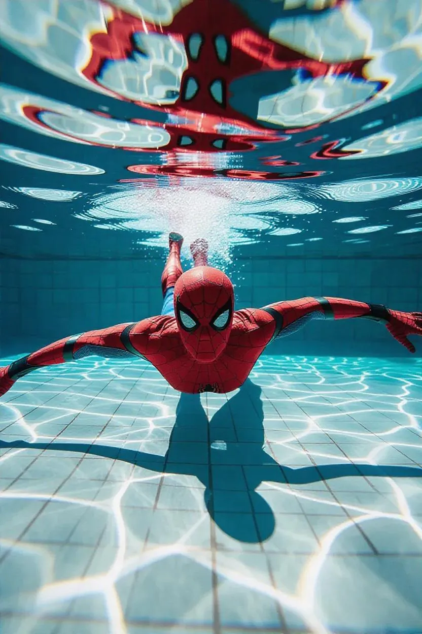 Spiderman, in his iconic red and blue suit, gracefully swimming in a crystal-clear pool, capturing the dynamic motion and fluidity of his movements, with ripples and splashes adding a sense of action and energy, set against a backdrop of sleek, modern pool tiles and sunlight filtering through the water.