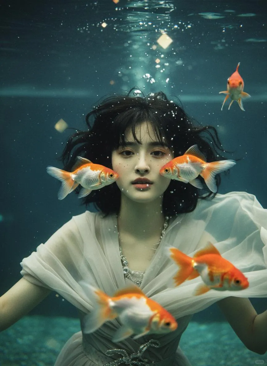 情绪氛围写真摄影,水下大型生态鱼缸内场景,上传的图中人物(面部特征不变,年龄、性别不变),脸颊带浅淡小雀斑,头发因水浮力微卷漂浮散开、发梢沾附细碎水珠;表情:眼神看向相机、唇瓣轻启带浅淡呼吸感,眉梢微垂显疏离落寞,下颌线轻绷;穿着:精致的定制高级夏季服装,布料因水浮力形成自然褶皱,高级精致的配饰;构图:近景的面部特写(人物面部占画面80%),多只大大的橙白/银白金鱼贴靠脸颊、发梢环绕互动,细小气泡在人物侧脸旁缓慢上升,金鱼在前景游泳,前景的金鱼虚化,水面波纹在背景模糊晕开;拍摄视角:平视近距离水下视角,镜头贴靠水面下3cm处,捕捉水面折射的破碎光斑;光影:柯达Portra 400胶片质感,细腻但清晰的胶片颗粒,轻微暗角;冷调青绿色水底漫射柔光,水面透入的菱形光斑,明暗对比弱但层次柔和,边缘轻微晕染模糊;配色:低饱和暗调基底(深青+墨黑+灰绿),点缀金鱼的暖调橙白/银白,色彩轻微偏青黄的复古胶片色调,整体氛围朦胧孤寂,水下光影对比强烈