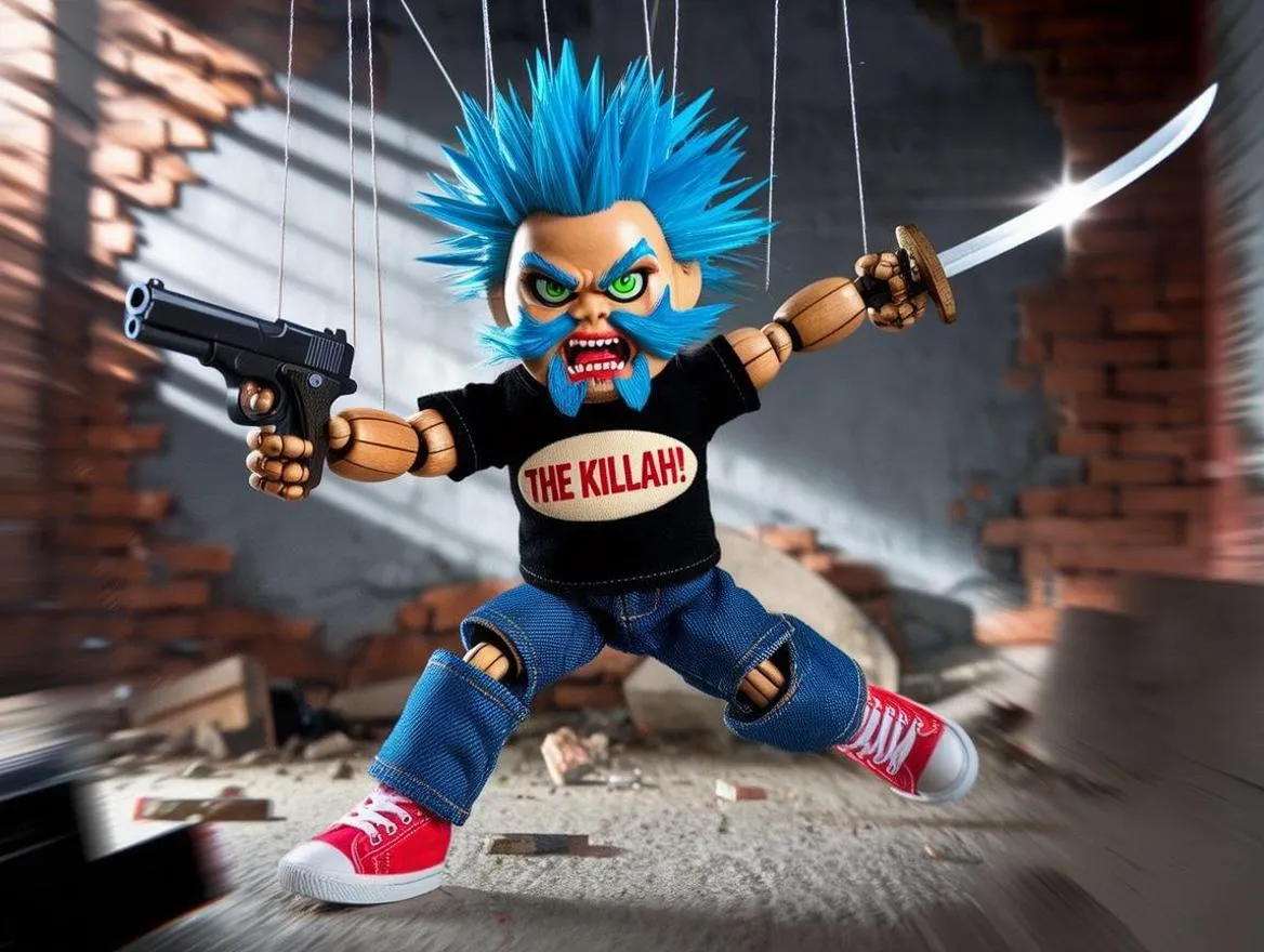 A dynamic action scene featuring a marionette doll suspended by strings, wielding a gun in one hand and a gleaming katana in the other. The doll wears a black t-shirt with "The Killah!" boldly printed in red on a cream oval patch, rugged blue jeans, and vibrant red sneakers. Crazy spiked DBZ-style blue hair and facial hair, intense green eyes. Intricately carved wooden joints contrast with a gritty urban backdrop of crumbling brick walls and scattered debris. Low-angle dramatic lighting casts sharp shadows, emphasizing motion blur as the doll lunges forward. Cinematic depth of field highlights its fierce, painted expression, blending whimsical puppet aesthetics with intense combat energy.