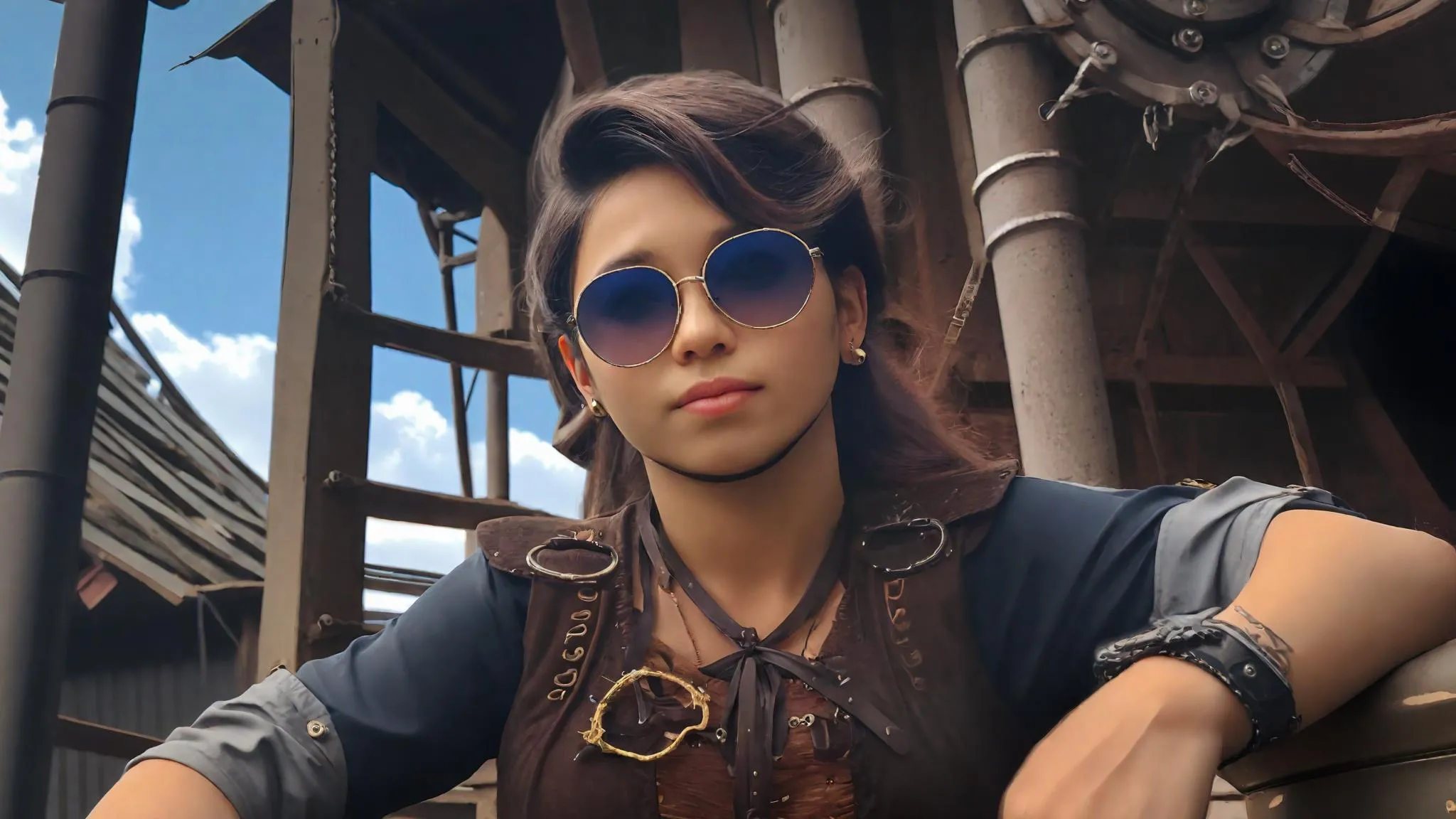 Create stunning Anime AI art: Generate a manga-style, fiery red-haired beauty in a steampunk cityscape. She wears a corset and textured canvas skirt, leaning playfully amidst gears and airships. Craft this captivating low-angle, medium shot featuring sapphire eyes and cherry lips with Vivago.ai's powerful AI image generator from text prompts.