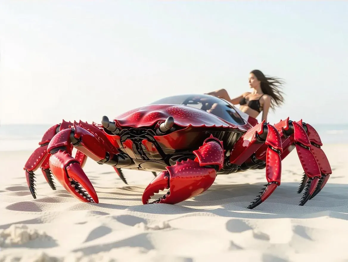 A uniquely designed crab-inspired car, driven by a woman, showcasing vivid red-black hues that mimic a crab shell. Elegantly curved sides resembling large crab claws, resting on multiple crab legs for support and artistic flair. Soft sandy beach, enhancing the playful elegance and coastal sophistication.