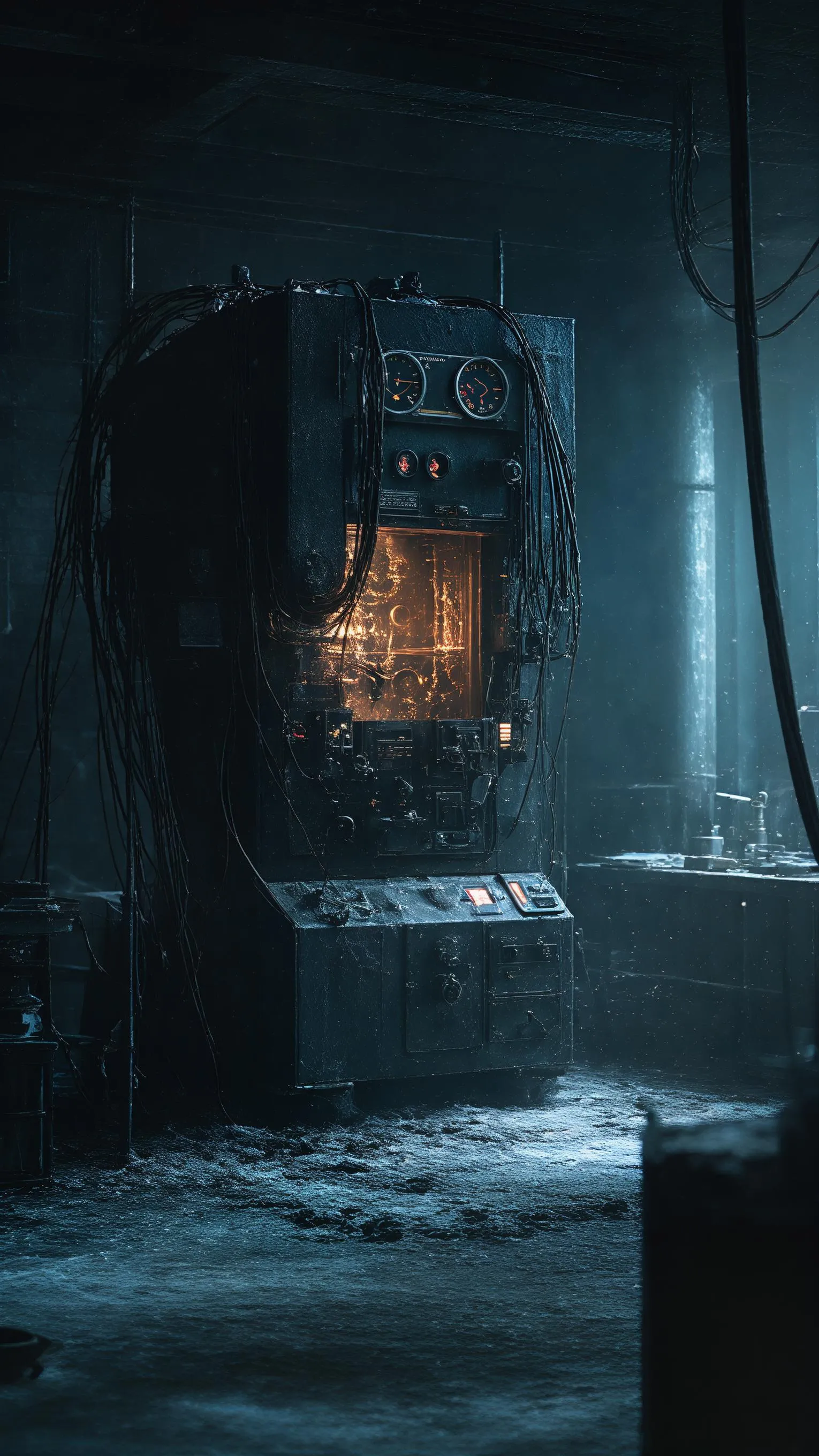 Generate eerie AI images of an abandoned lab with a dormant yet alive machine pulsing internally. Capture cinematic horror realism: deep shadows, oppressive silence, high contrast lighting, soft film grain. Create this dark, atmospheric scene using Vivago.ai's powerful text-to-image generator for professional visuals. Perfect for horror & sci-fi concepts.