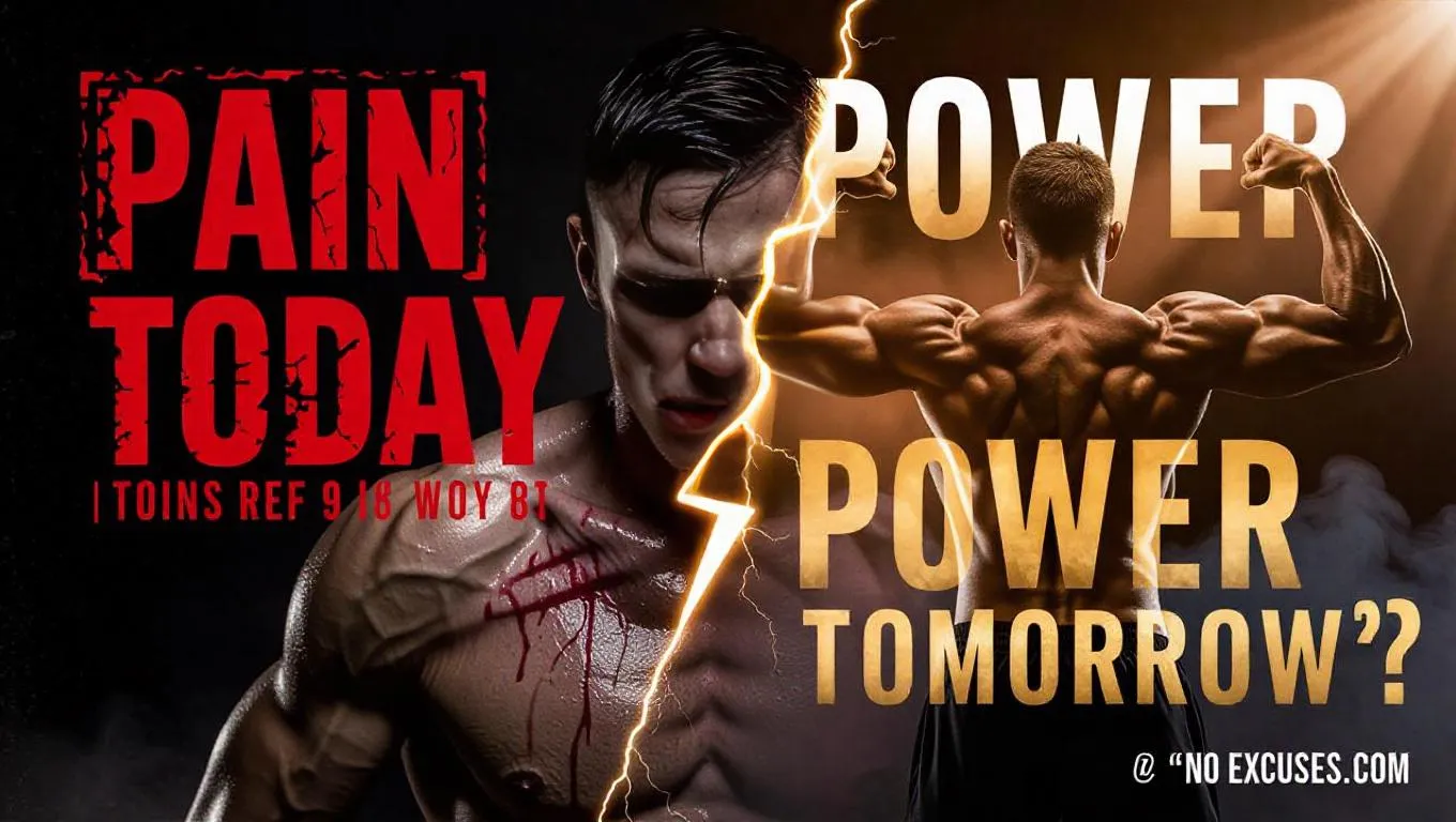 AI-generated split-background motivational artwork contrasting gritty pain (dark tones, strained athlete) vs. fiery power (golden victory, flexed muscles). Bold "PAIN TODAY / POWER TOMORROW" typography with texture effects. Ideal for gym motivation, fitness branding, or no-excuses mindset visuals. Customize flames, lighting, and atmospheric smoke using AI art tools.