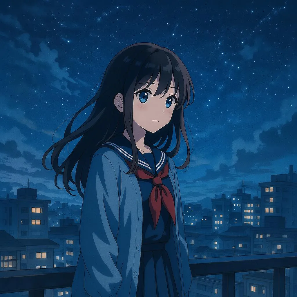 Generate a quiet anime girl on a Kyoto Animation style dusk rooftop. Emotional, cinematic scene with detailed character design under a starry sky. Features soft glows, delicate features, cool blue tones, and atmospheric night cityscape. Create cinematic anime art at vivago.ai.