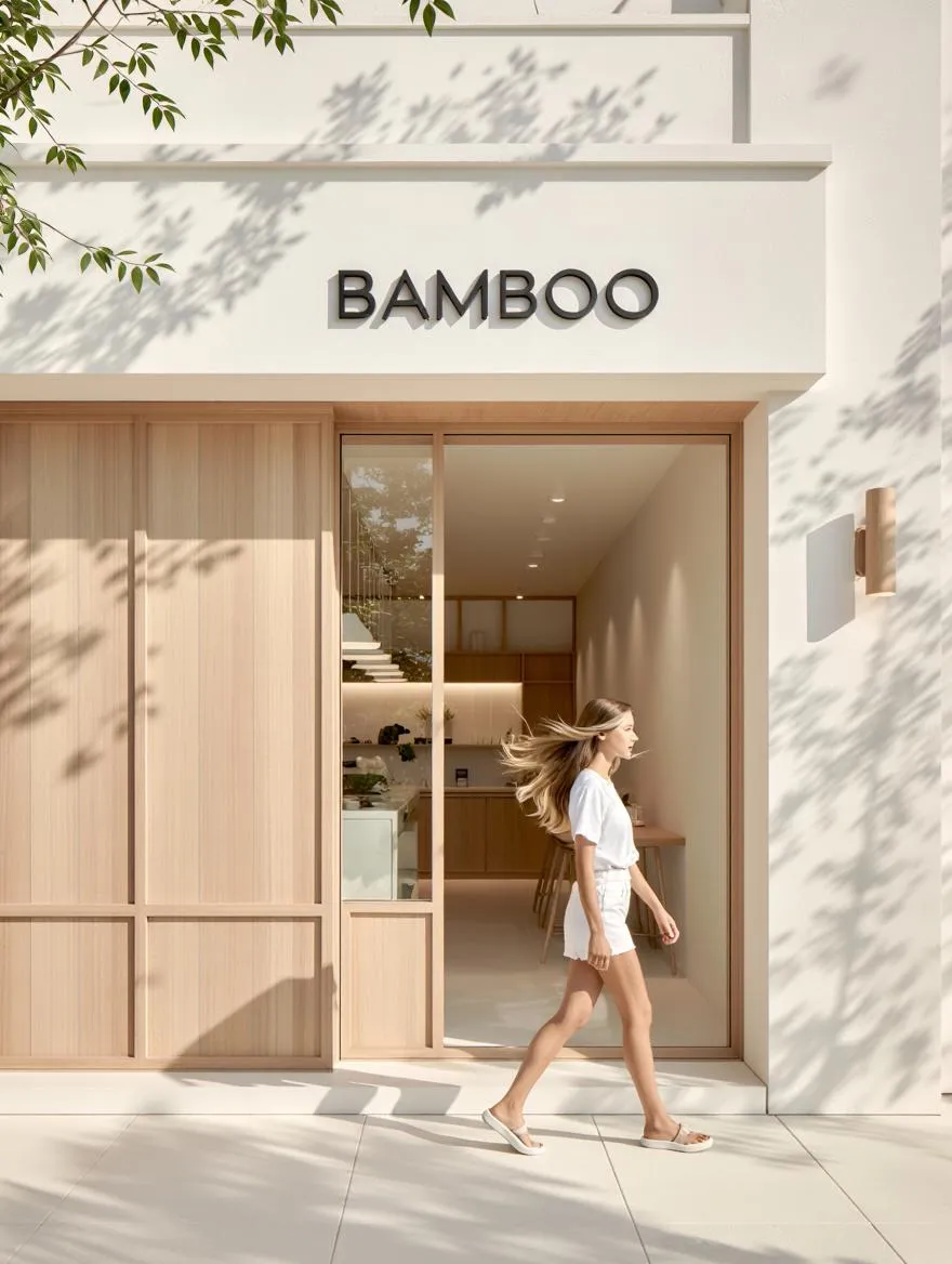 Architectural illustration of a minimalist coffee shop exterior with the sign “Bamboo” above the entrance. The façade features a harmonious blend of light wood panels and crisp white walls, with clean lines and subtle textures. A young woman with flowing hair and casual elegance walks past the entrance, adding motion and human warmth. The perspective is precise and refined, in the style of professional architectural renderings. Soft natural lighting casts delicate shadows, highlighting material contrast and spatial rhythm. Highly detailed, serene, and stylish—evoking modern lifestyle aesthetics with a touch of artisanal charm.