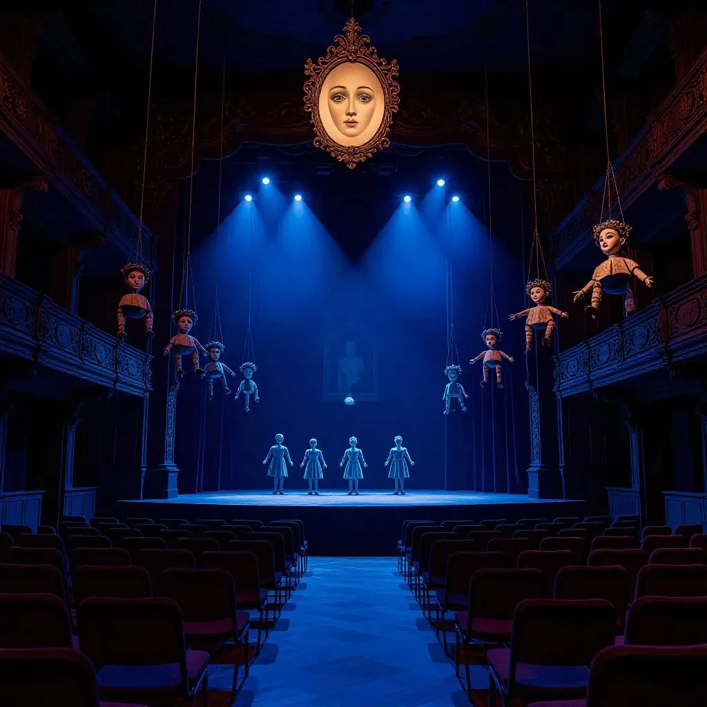 A moonlit derelict opera house filled with weathered marionettes frozen mid-performance. Elaborate puppets with ivory-carved faces, cracked jeweled eyes, and tattered velvet robes hang from tarnished silver strings, limbs contorted in tragic poses. Pale blue light spills through shattered stained glass, casting kaleidoscopic shadows across rotting velvet seats and a stage littered with broken music boxes. A spectral puppetmaster's faded portrait glows faintly above the proscenium, hollow eyes controlling the dance as cobweb-covered chandeliers sway silently. Ultra-detailed textures: moth-wing lace collars, oxidized copper joints, and clockwork hearts visible through cracked chests. Cinematic low-angle framing emphasizing towering marionettes against arched ceilings, cold moonlight blending with flickering candle remnants for haunting chiaroscuro.