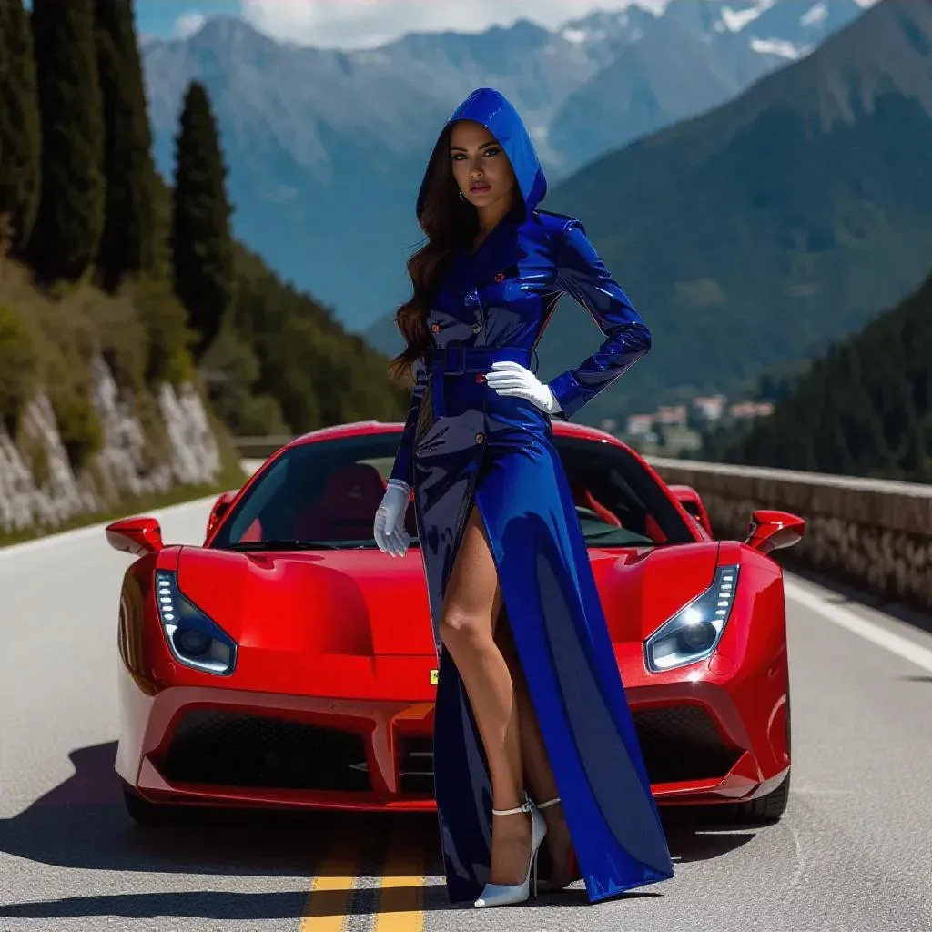 Generate a sleek AI image of an Italian woman with long dark hair beside a red Ferrari on a mountain pass. Dressed in a glossy royal blue PVC trench coat, hood up, with white heels and gloves. Craft professional visuals using Vivago.ai's AI tools for dynamic image/video effects and precision editing.