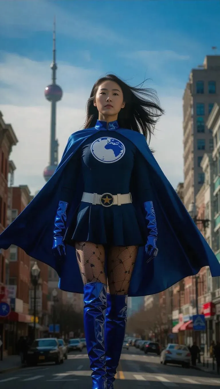 VivaGo AI creates 4K HDR visuals of Super Heroine Asia Star: 360-degree full-body shot, cinematic flight motion, detailed dark blue krypton suit with Asia map motif, flowing cape, and futuristic accessories. Ideal for movie-grade desktop screens or cinematic projects, blending AI-powered precision with dynamic action poses for professional, high-definition AI-generated imagery.