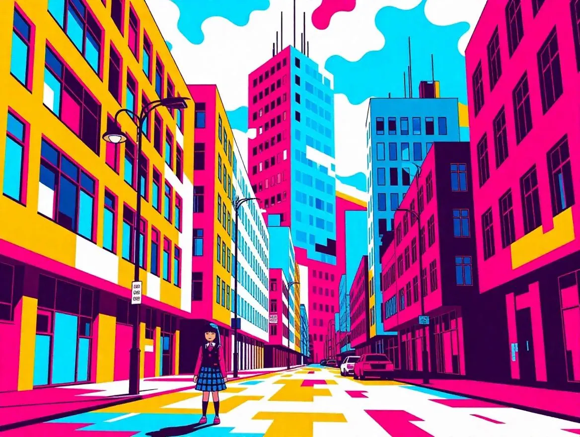 Generate retro USSR brutalist cityscape AI art featuring towering structures, a cute schoolgirl stroll, and scanline effects. VivaGO.ai transforms text prompts into visual masterpieces with white glass, blue, mustard, and raspberry hues for professional, unique results.