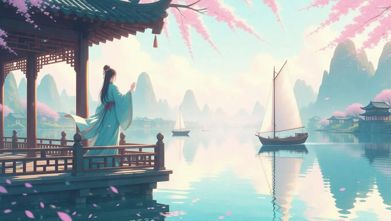 A Tang poet stands on the tower of Yellow Crane Pavilion, waving farewell to a friend’s boat sailing down the Yangtze River in misty spring. Cherry blossoms drift in the air, willows sway along the riverbank. In the distance, a lone white sail fades into the turquoise sky. The poet’s flowing robe and wistful eyes capture the essence of the moment. Soft anime lighting, glowing water, and painterly clouds enhance the serene and emotional farewell scene.