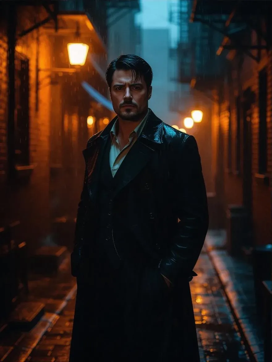 Text to ImageMisha Collins as Konstantin, intense and brooding, standing in a dimly lit, rain-soaked alley, his expression a mix of determination and sorrow, with a vintage film noir aesthetic, capturing the essence of the film Konstantin.Recreate