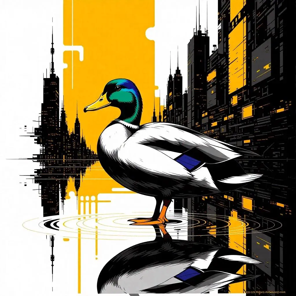 Create striking neo-noir ink drawings of mad ducks with vivago.ai's AI tools. Generate bold white and yellow-orange palettes for high-contrast, dramatic visuals. Perfect your art with curated AI effects and professional editing features for immersive, stylized AI-generated imagery.