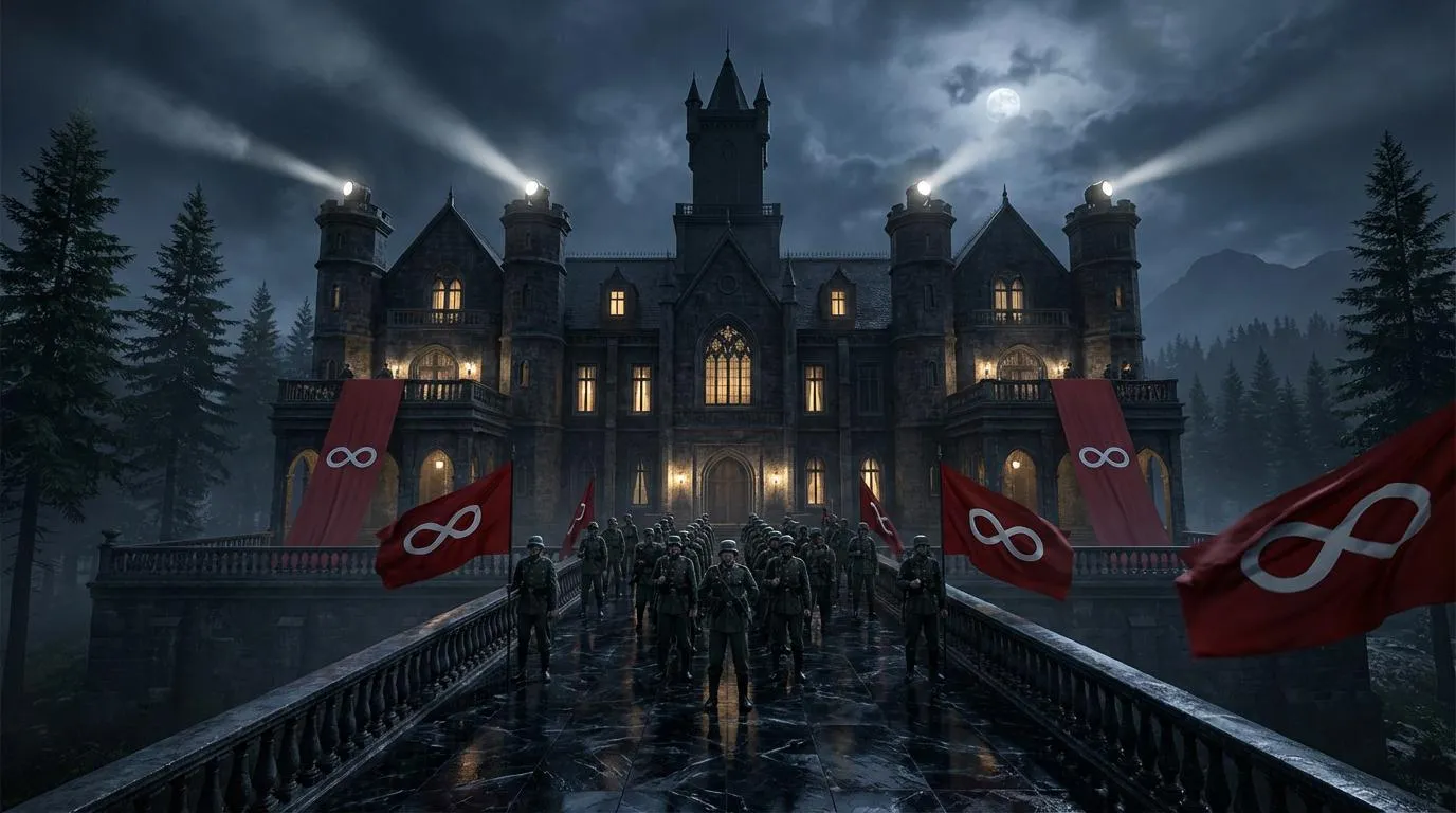 Generate haunting AI visuals: ultra-wide Gothic mansion with infinity-sign banners, sentry towers, and 1940s German soldiers on wet marble walkways. Create dramatic night scenes featuring red flags and towering architecture using vivago.ai's AI image generator tools. Transform text prompts into professional-grade dark fantasy imagery effortlessly.