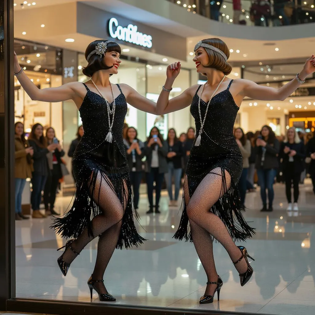 Two 1920s flapper girls, one in a black fringe dress with silver jewelry and a vintage headband, the other in a sleek black dress with glitter trim, fishnet stockings, and sparkling accessories, dance an energetic Charleston routine behind a glass window in a modern shopping mall. They lift one leg in sync, arms out, swinging and twisting with joyful rhythm, their bob-cut hairstyles bouncing with the motion. Neon mall lights reflect off the glass, creating a ripple effect. Pedestrians gather outside, laughing and filming the scene on their phones. Interior lighting highlights the contrast between the vintage dancers and the sleek mall setting. Cinematic 4K, fast-paced vintage swing energy, joyful expressions. Camera moves fluidly: tracking shot of their dance, zoom in on synchronized leg kick, focus shift to crowd reactions.