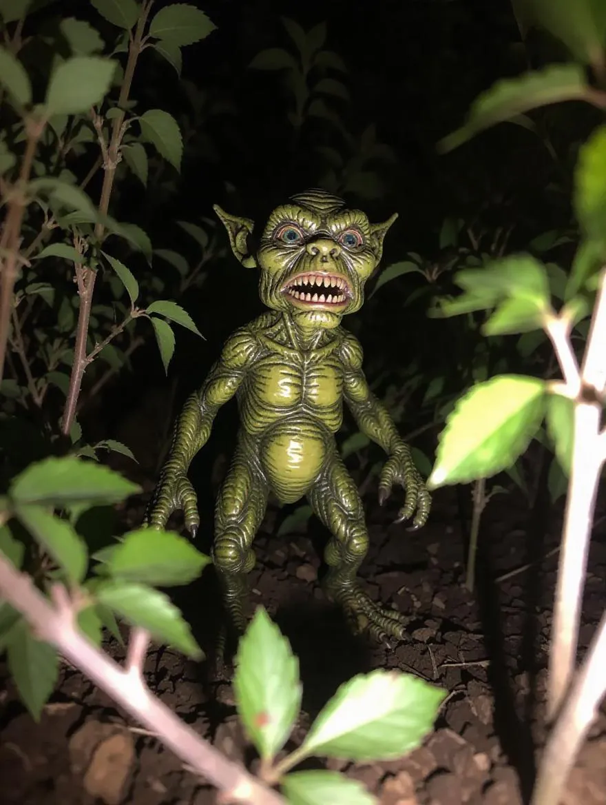 Generate an AI image of a little garden monster hiding in darkness, dramatically illuminated by a flashlight. Use vivago.ai's free image generator to transform this spooky prompt into professional visuals with custom lighting effects and eerie atmospheres.