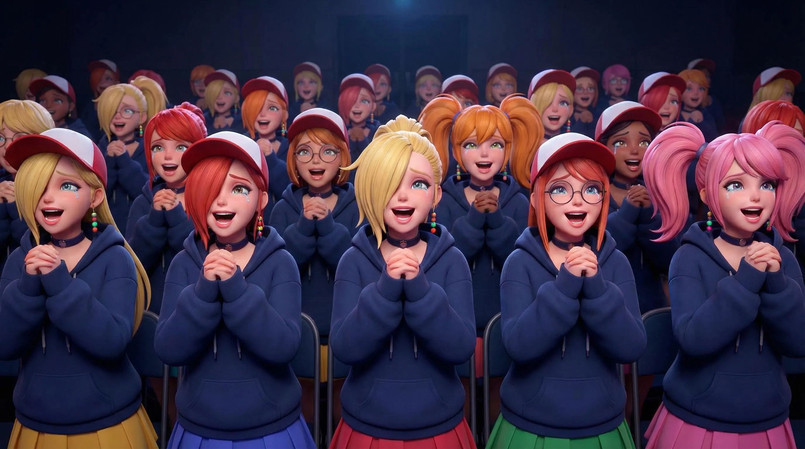 Create anime-inspired CGI crowds with Final Fantasy hairstyles in deep blue hoodies featuring moe sleeves hiding praying hands. Vibrant accessories like baseball hats, chokers, and colored nails. Generate diverse characters with elated expressions, side-swept hair, and unique sleeve styles using this AI image generator for vivid fan art scenes.