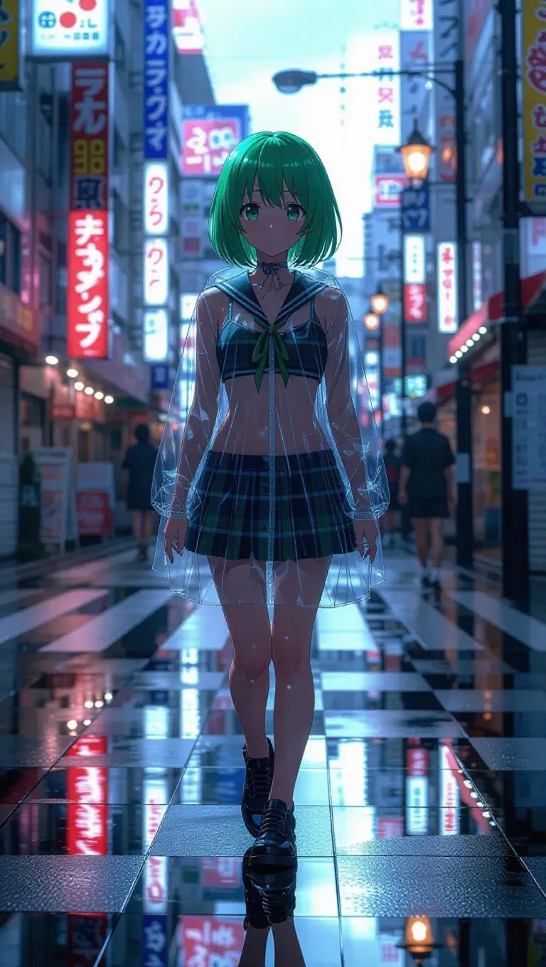 Generate anime art with AI: green-haired loli in transparent raincoat walks through Akihabara's Googie architecture. Featuring checkered tiles, static noise, data posters, and see-through ecchi elements. Create professional AI images/videos instantly at VIVAGO.AI.