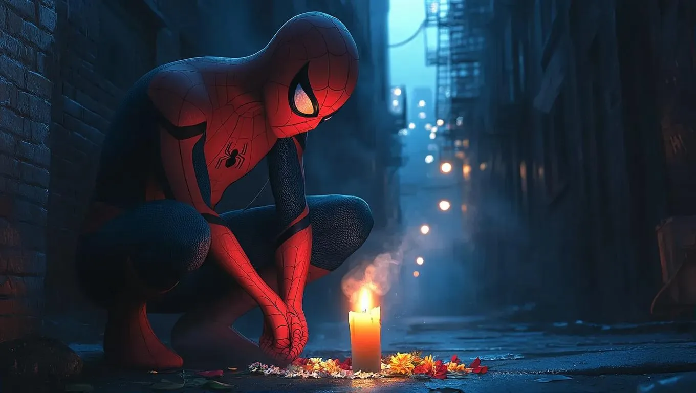 Create heart-wrenching Spider-Man AI art of Peter Parker's candlelit vigil in a twilight alley. Realistic AI-generated image captures grief and solitude through a flickering makeshift memorial, misty shadows, and warm-cold contrasts. Perfect for evocative superhero narratives, mourning scenes, or emotional character studies with professional-grade AI visual generation.