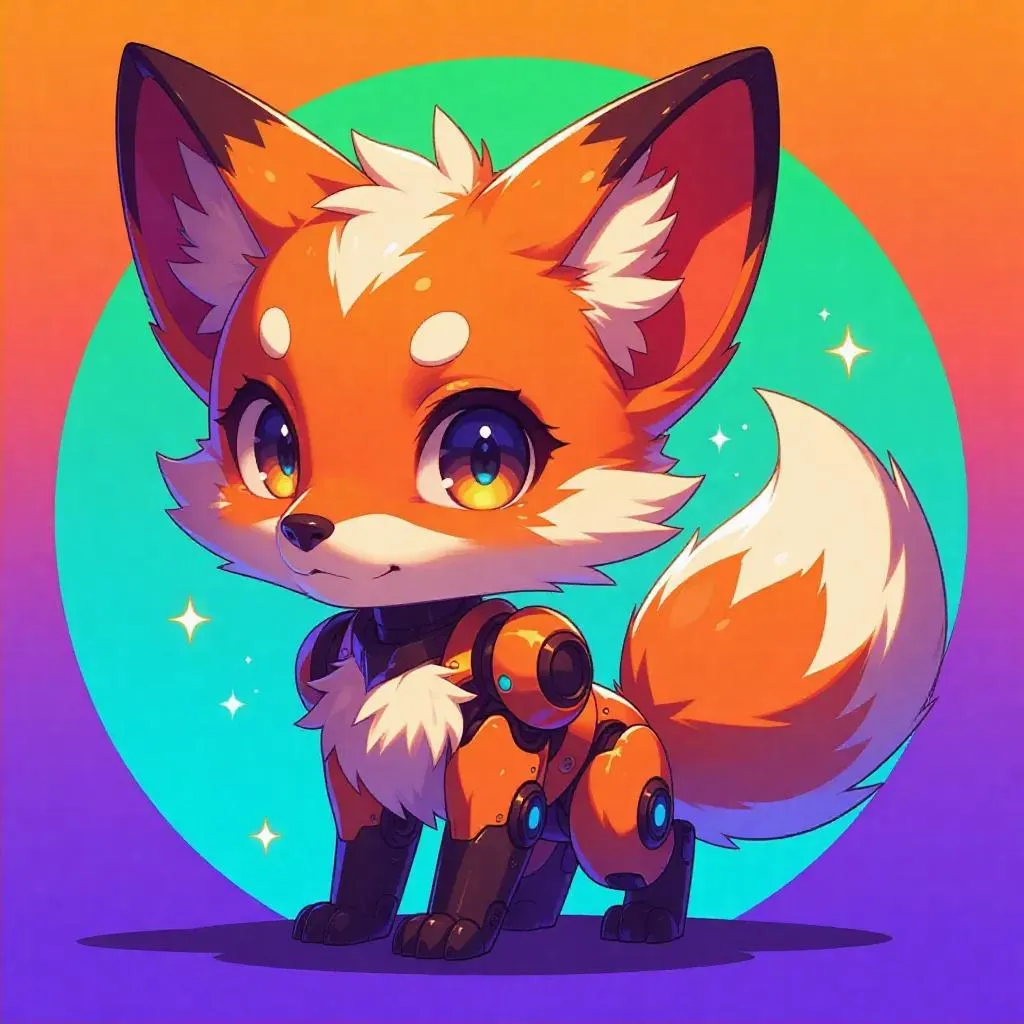Chibi art style robot fox, international orange colors, playful and whimsical, detailed fur texture, large expressive eyes, set against a vibrant gradient background, exuding a sense of curiosity and adventure.