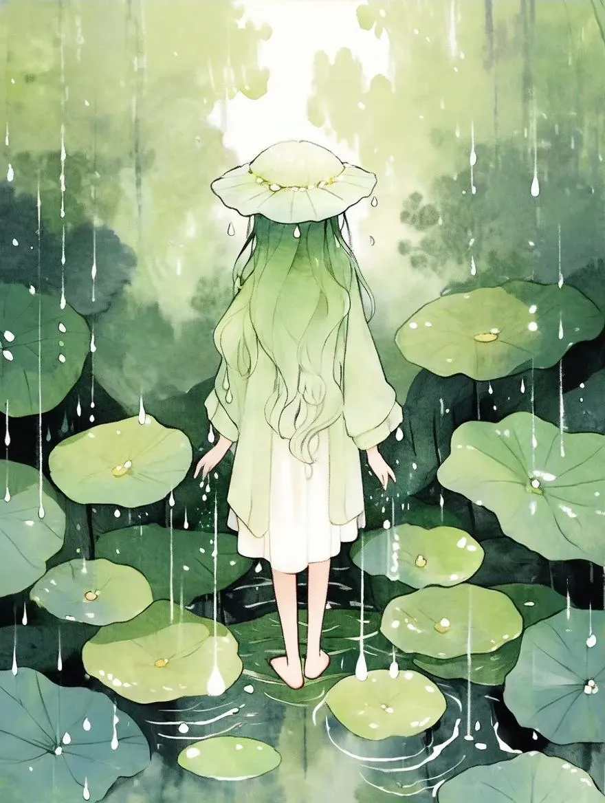 Capture a serene Studio Ghibli-inspired scene of a gentle girl with white-green gradient hair standing on lotus leaves in summer rain. Watercolor textures, flat-style outlines, and sage-green gradients blend with fresco-like backgrounds. Delicate raindrops, soft cardigan sleeves, and blue-gray tones evoke a healing, expressive mood—AI-generated tranquility merging Studio Ghibli charm and watercolor artistry.