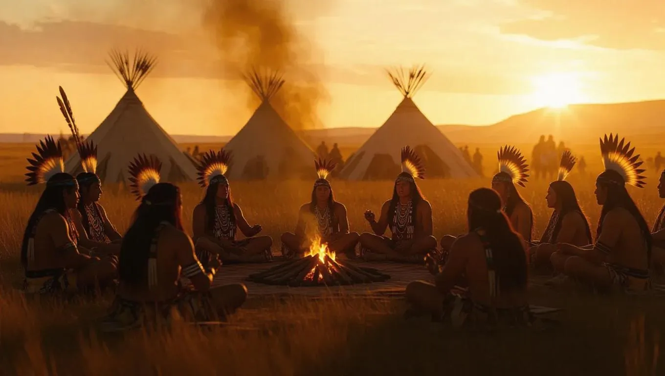 Vivid AI-generated scene of a Native American ceremonial gathering at dusk: golden tall grass, crackling bonfire, feathered pipe, and dome huts under amber skies. Ethereal sunset gradients highlight intricate regalia, tribal tools, and silhouetted horses. Cinematic lighting enhances muted earth tones for a wide-angle, atmospheric portrayal of tradition and twilight serenity.