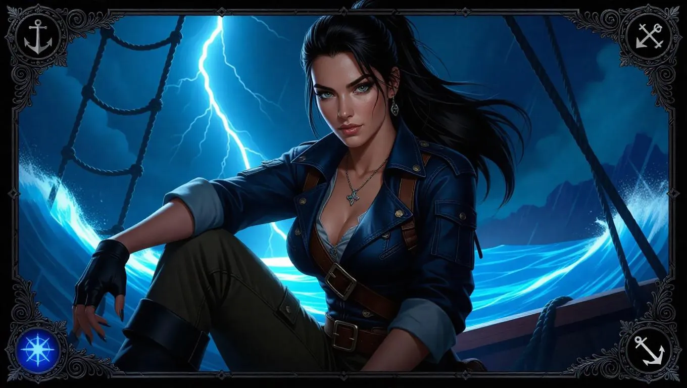A daring pirate vixen with sleek hair tied back, clad in a practical jacket and cargo pants, radiating confidence and wit. She grips a trusty knife while sitting on the bridge of her ship, with turbulent waters and streaks of lightning casting an electrifying glow. The card border displays nautical stars and anchor symbols, embellished with matte black and silver designs, and dotted with rich blue lapis lazuli.