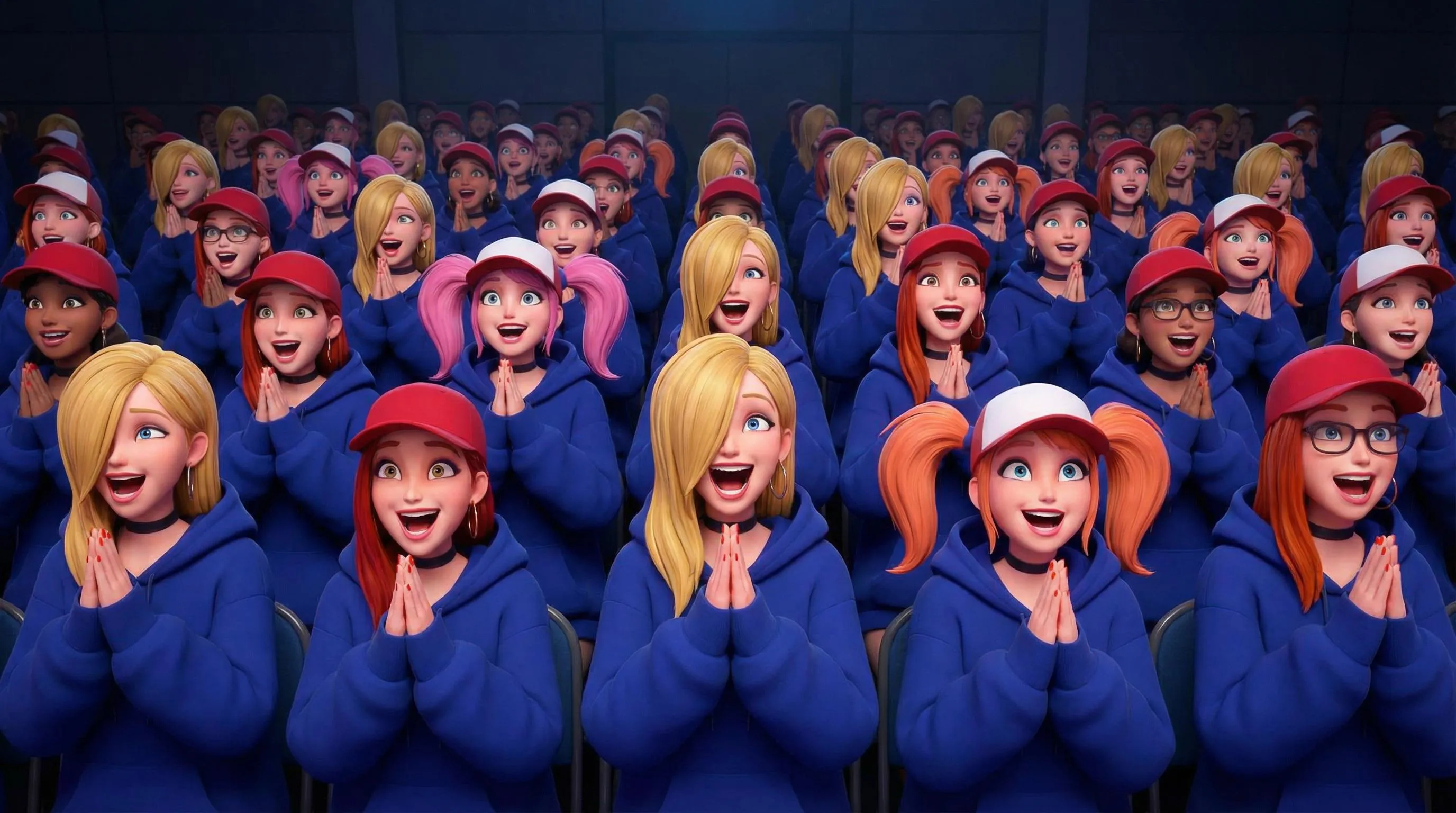 Generate lively CGI anime women inspired by Final Fantasy with vibrant multicolored hair & side-swept styles. Adorned in deep blue moe-sleeve hoodies hiding hands, red/white hats, chokers, skirts, & long nails. Capture their elated expressions, admiring prayer pose, & joyful screams in this vibrant digital art scene. Perfect AI anime character creation.