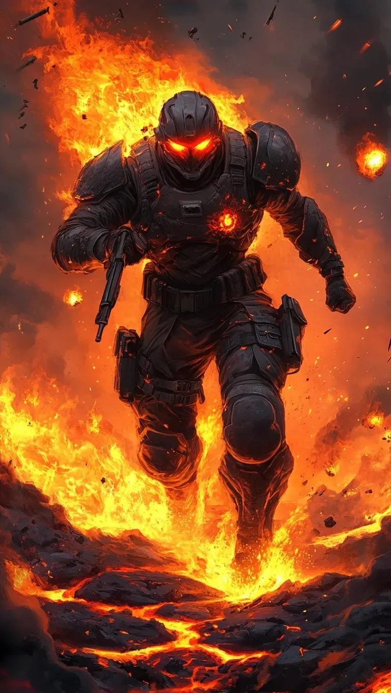 Epic AI-generated art of a muscular Fire Soldier charging through fiery chaos: molten lava, explosions, and smoke. Dark fantasy atmosphere with dramatic lighting, glowing eyes, and hyper-detailed digital painting style. Create intense, professional-grade visuals with VIVAGO.ai's AI image generator for epic battle scenes and fiery fantasy landscapes.