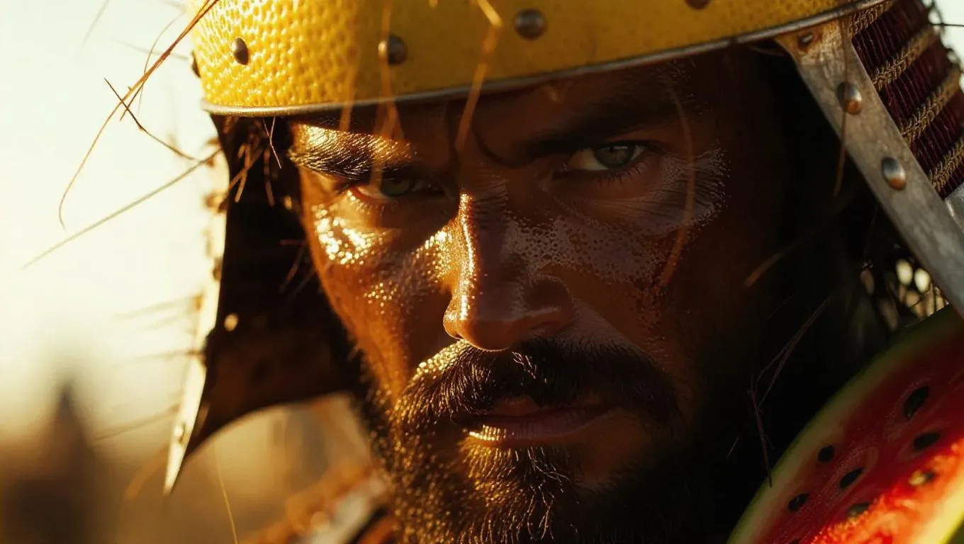 Transform text into AI-generated visuals of a seasoned warrior with a lemon helmet, wielding watermelon machete and coconut shield. Vivago.ai’s creative AI tools craft dynamic, imaginative scenes—battle-scarred landscapes, cinematic pans—turning prompts into striking, professional-grade visuals effortlessly.