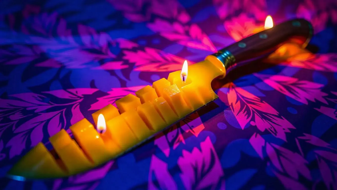 Text to ImageA unique machete crafted from vibrant mango slices, illuminated by a flickering candlelit glow, set against an ornate, soft shadow background, creating a surreal and artistic composition.Recreate