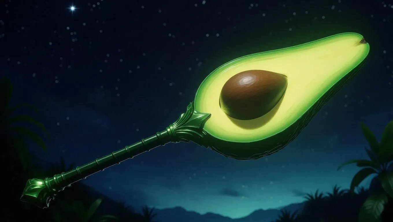 A glaive crafted from overlapping avocado segments, with a translucent, dark green core that emits a soft, celestial glow. The weapon has a sleek, minimalistic design, set against a starry night sky that enhances its otherworldly beauty. The scene is bathed in soft, subdued light, with stars twinkling in the background. The style is fantastical, blending realism with ethereal elements.