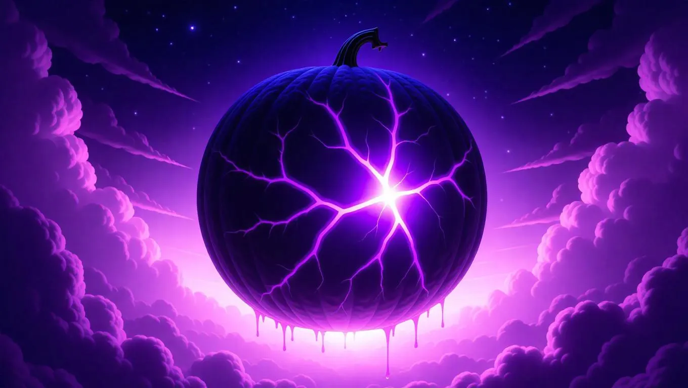 An enormous melon mace with a cracked surface, glowing purple juice leaks from the fissures, casting an ethereal glow in the starry sky, surrounded by a halo of floating clouds.