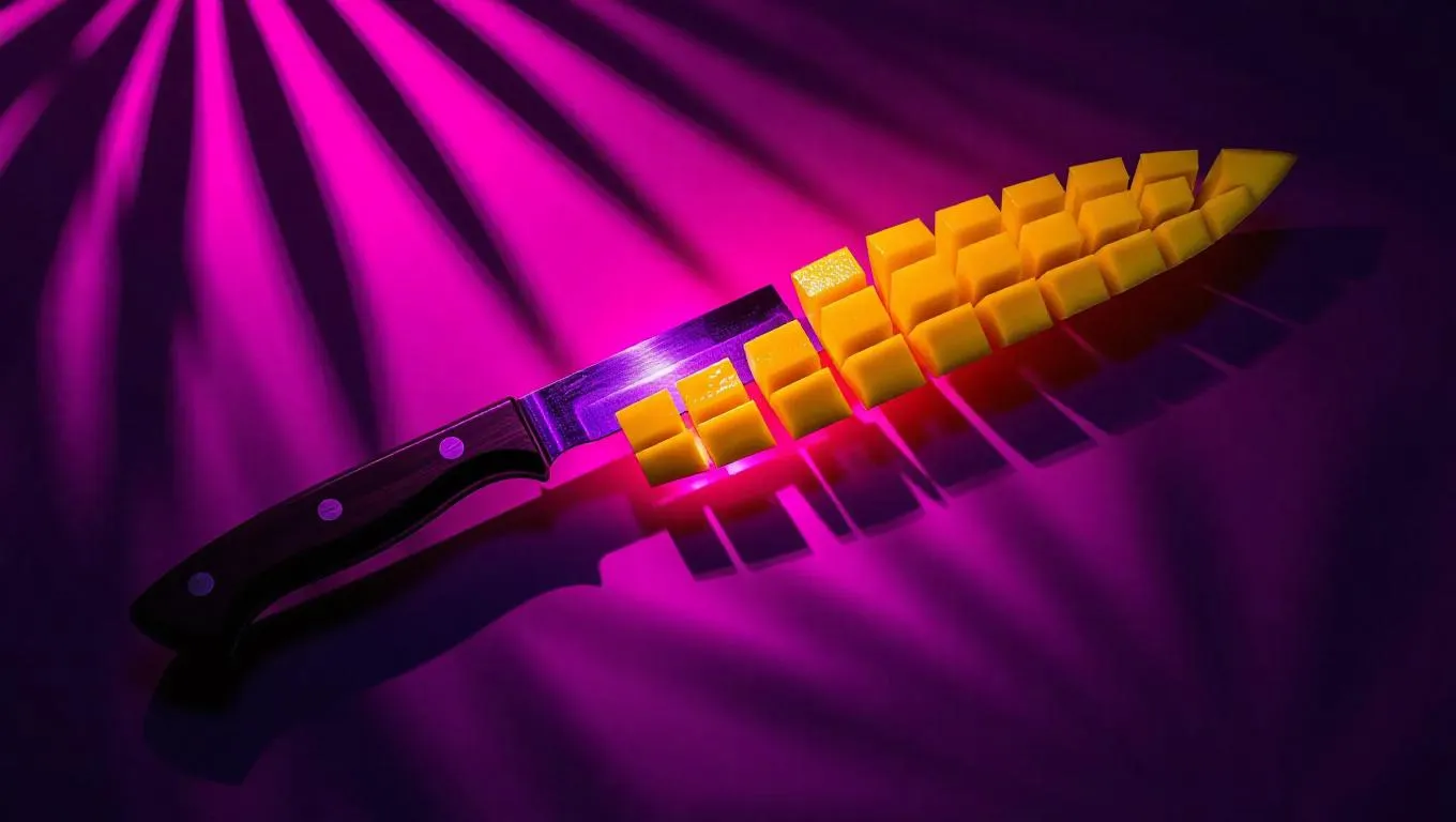 A unique machete crafted from vibrant mango slices, illuminated by a dim purple light, set against a abstract, dark shadow background, creating a surreal and artistic composition.