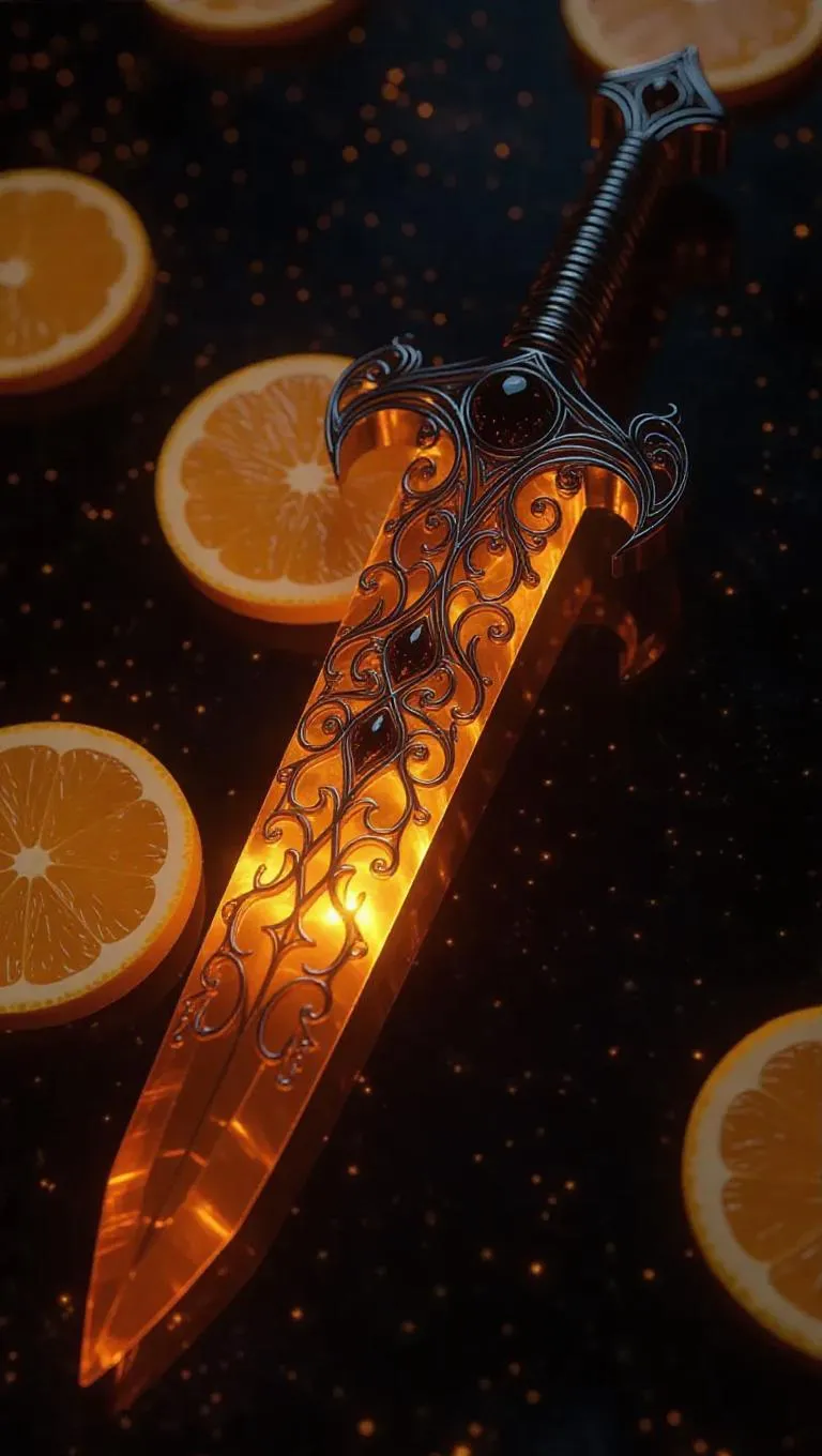 A dagger meticulously carved from translucent citrus slices, featuring a shimmering obsidian core that radiates a dark, mysterious glow. The intricate and delicate design is set against a cosmic background, enhancing its ethereal and elegant appearance. The lighting is starlit, creating a celestial ambiance that highlights the dagger’s translucency and obsidian core, creating a cosmic and magical atmosphere. The style is whimsical and realistic, blending detailed craftsmanship with an otherworldly aesthetic.