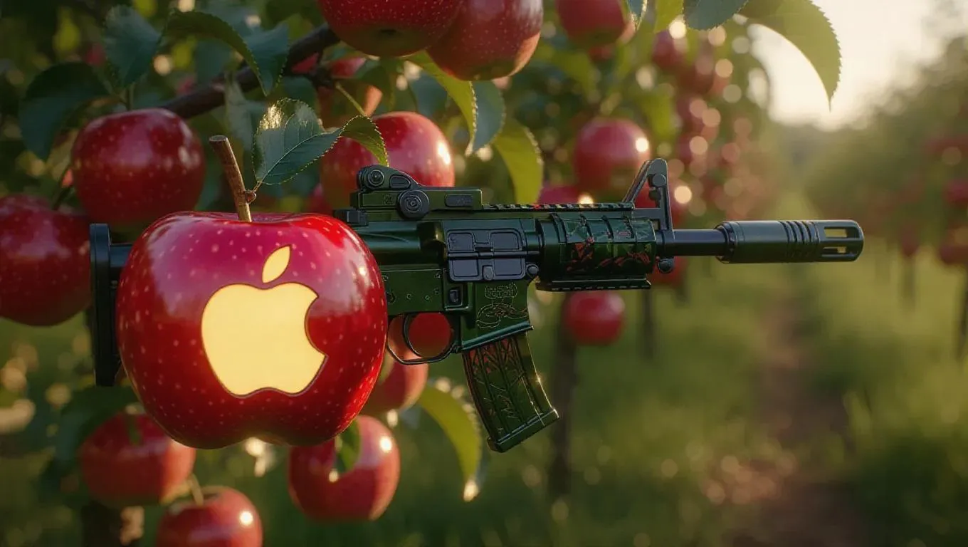 A grenade launcher intricately carved from an apple, featuring a shiny red and green design that glows softly under the afternoon light. Set against a peaceful, afternoon orchard, the weapon exudes a playful and cheerful energy. The orchard's fruit-laden trees and afternoon sky enhance the surreal and vivid nature of the scene. Soft afternoon light casts gentle shadows, highlighting the weapon's unique texture and color. The style is a blend of realistic and fantastical elements, creating a visually striking image.