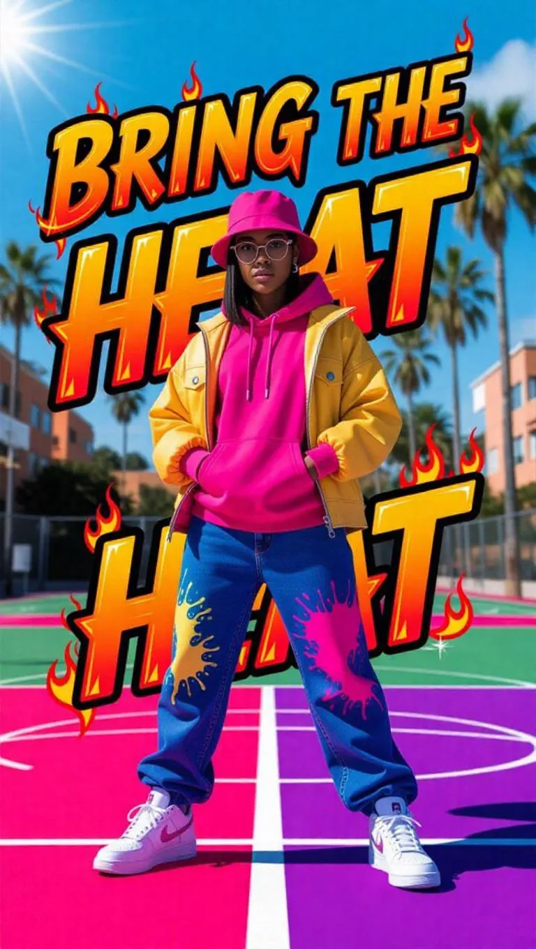 Generate a vibrant AI illustration of a stylish individual in a bright yellow jacket, pink hoodie, and paint-splashed jeans on a sunny basketball court. Featuring palm trees, urban backdrop, bold "BRING THE HEAT" text with flames, sparkles, and energetic cartoonish style. Perfect for dynamic visuals with vivago.ai's AI image tools.