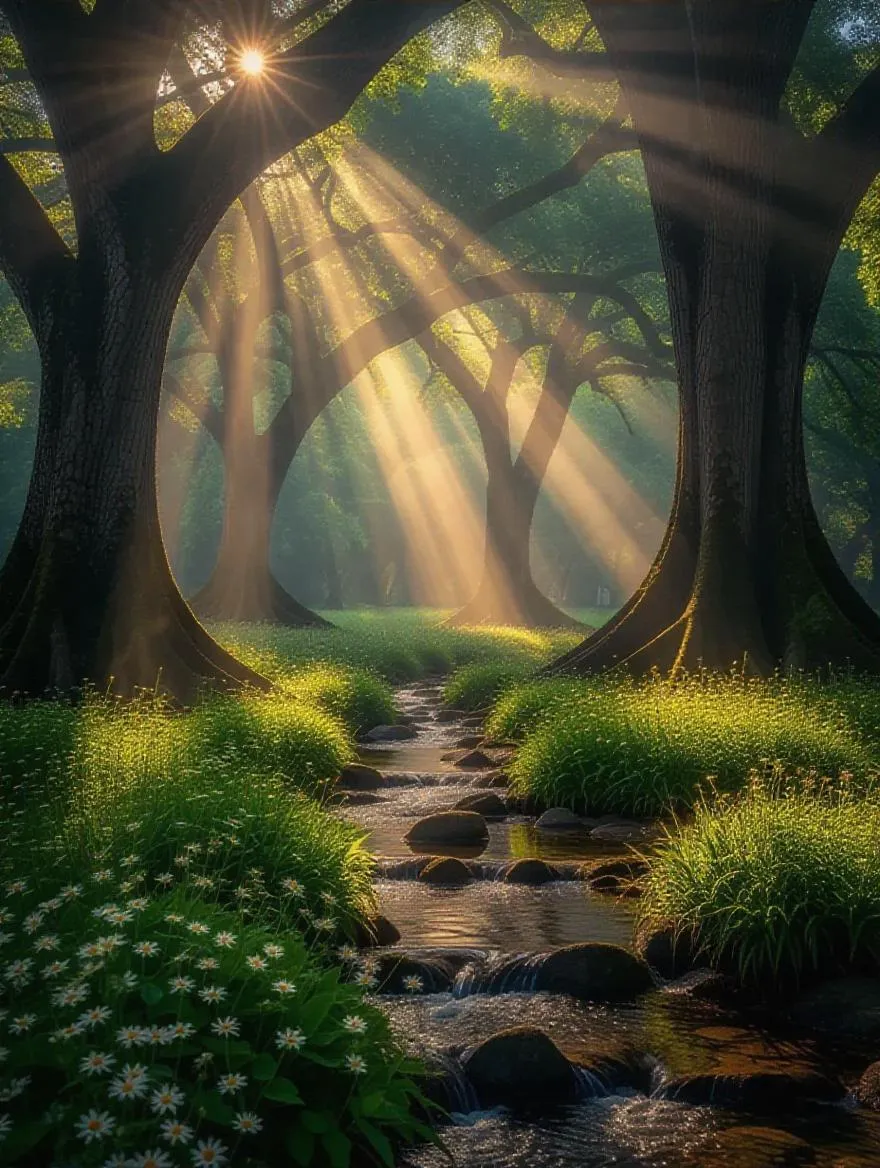 A serene forest clearing bathed in golden sunlight, towering ancient trees with gnarled roots, a crystal-clear stream meandering through the landscape, vibrant wildflowers dotting the ground, and a gentle mist rising from the earth, creating an ethereal and tranquil atmosphere.