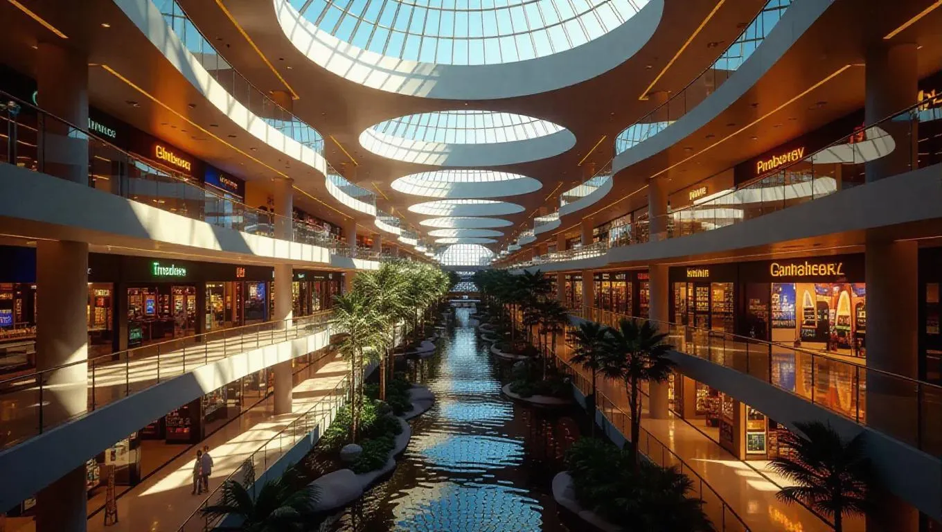 Experience vivago.ai's AI-generated futuristic amusement park: a breathtaking 50-story vertical wonder with multi-tiered thrill rides lining a central atrium. Soar past interactive exhibits under a massive glass-domed ceiling. Sleek balconies offer panoramic views of vibrant arcades and attractions, all bathed in natural light. Create your own immersive entertainment complex with AI-powered creativity.