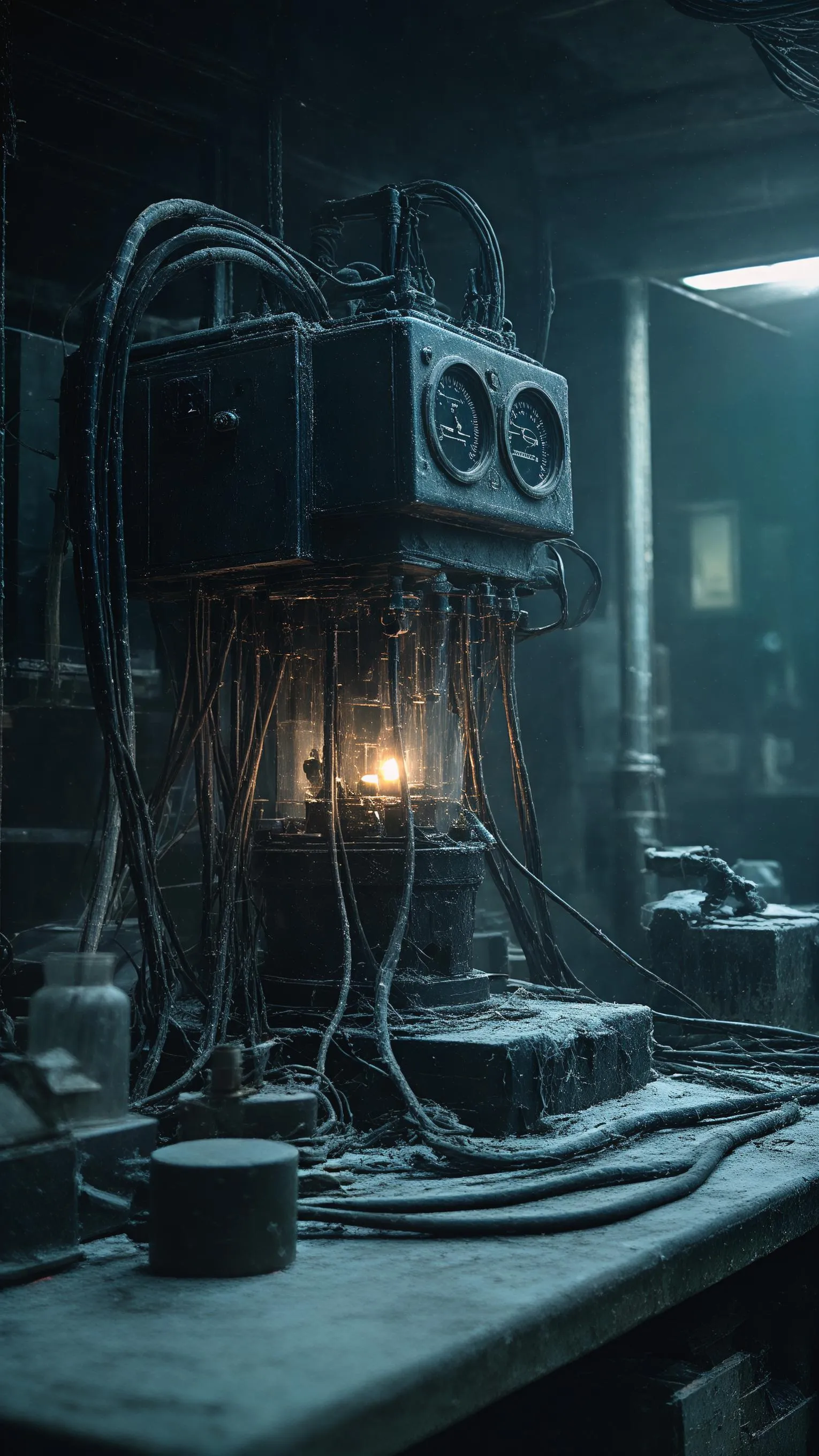 Generate AI cinematic horror visuals with this dark abandoned lab prompt. Create terrifying images of a lifeless machine with faint pulse, high contrast lighting, and oppressive silence. Vivago.ai transforms text into professional-grade cinematic horror realism, deep shadows, and soft film grain effects effortlessly.