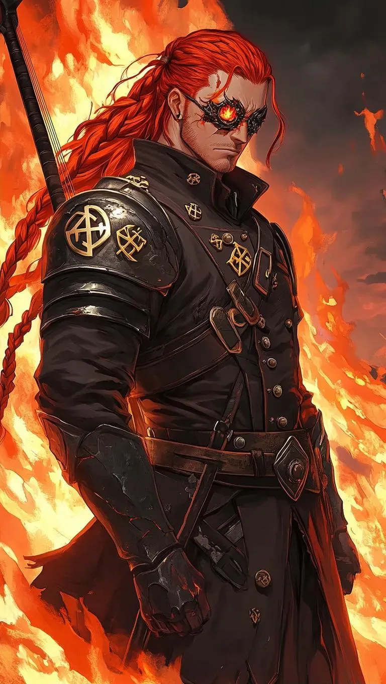 Vivid AI-generated anime fantasy art of a muscular warrior with fiery braids, clad in a burnt military coat and tuning fork-etched armor. Wields a flaming greatsword doubling as a stringed instrument, standing before a battlefield with blazing wing-like flames. Bold red-orange and blackened steel contrast highlights his fierce yet sorrowful expression and molten glass monocle. Dramatic, intense visuals.