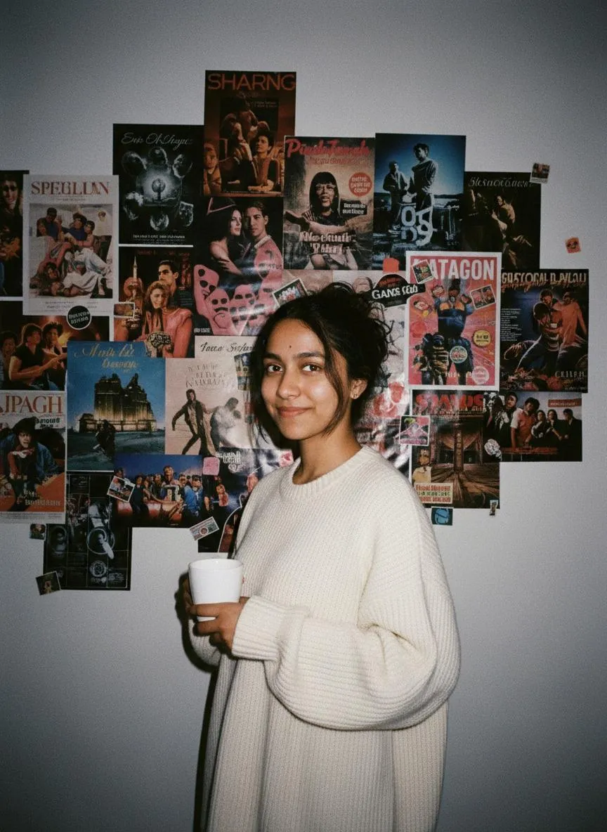 不改变上传的人物的原本的面容,用一台1990年代风格的相机,搭配前置闪光灯,为上传的人物创作一幅肖像。凌乱的深棕色头发扎起,脸上挂着平静而俏皮的微笑。身穿一件现代感十足的奶油色宽松毛衣,一只手拿白色咖啡杯,微笑看向镜头。背景是一面深白色的墙,墙上贴满了美学杂志的海报和贴纸,在昏暗的灯光下,营造出舒适的卧室或私人房间氛围。复古色调,胶片复古写真,颗粒感,高清细节