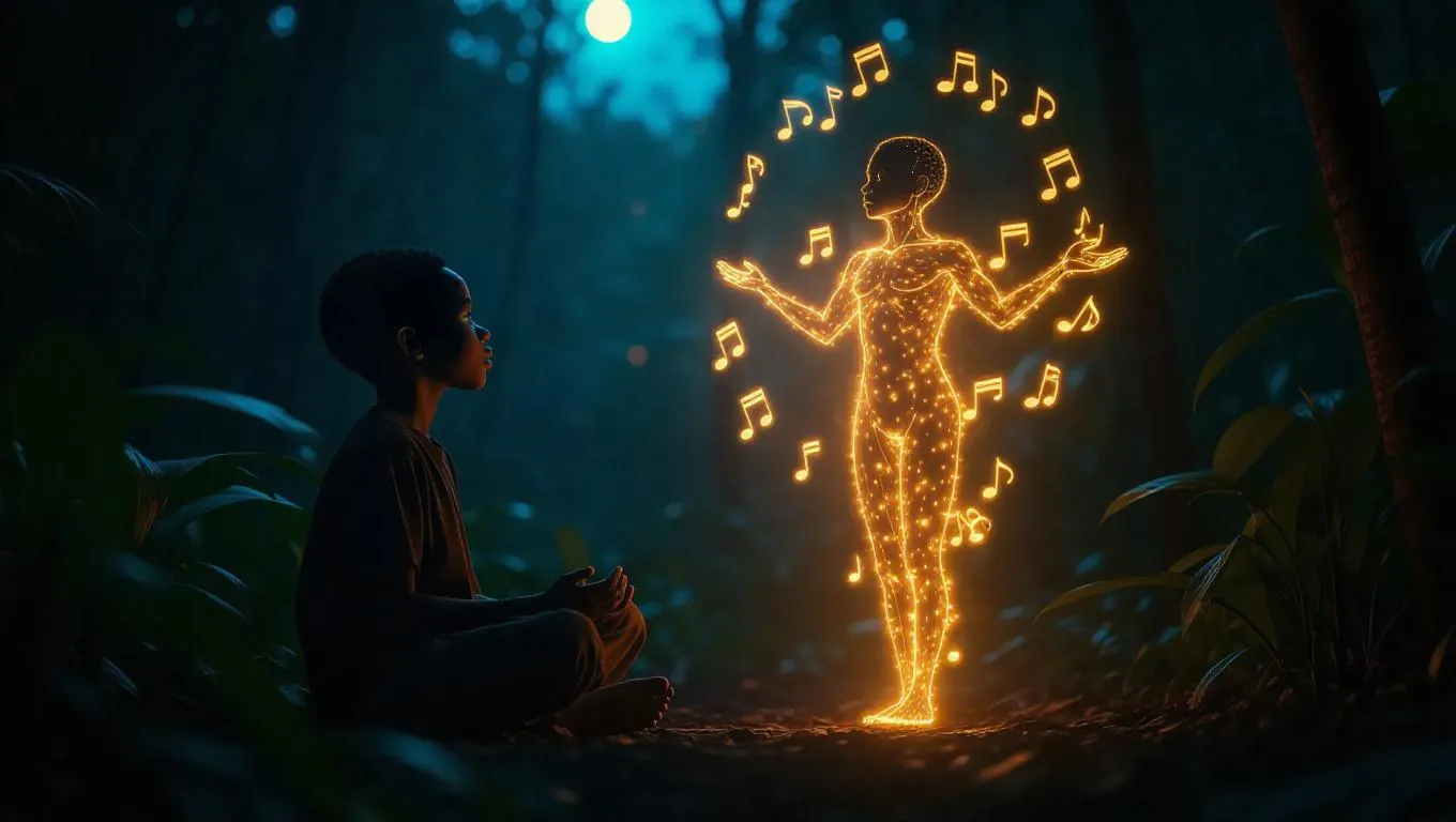 Generate mystical AI art of a glowing spirit with musical notes appearing to an African boy in a sacred forest. Capture ancient energy, ethereal light, and mystical atmosphere with AI tools for enchanting visual storytelling and professional-grade spiritual imagery.