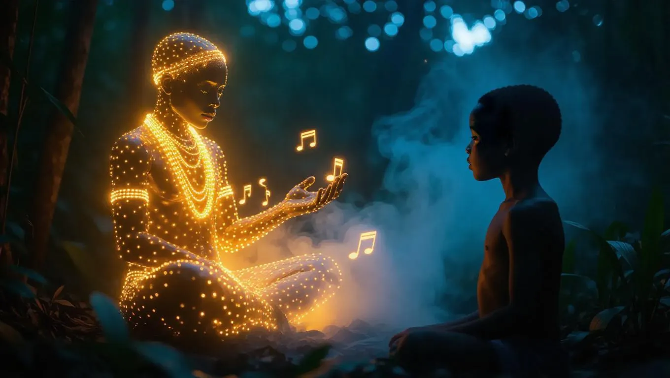 Generate mystical AI art of a glowing spirit with musical notes appearing to an African boy in a sacred forest. Capture ancient energy, ethereal light, and mystical atmosphere with AI tools for enchanting visual storytelling and professional-grade spiritual imagery.