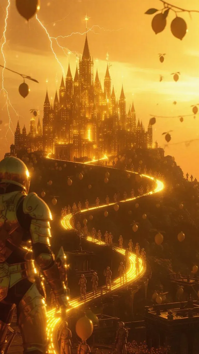 A radiant city constructed from luminous lemons perches atop a hill, every structure sharply geometric and gleaming. The air is infused with the scent of citrus and fire. Citizens clad in armor crafted from crystallized peel navigate the streets, while lightning crackles between the buildings, infusing them with vibrant energy.