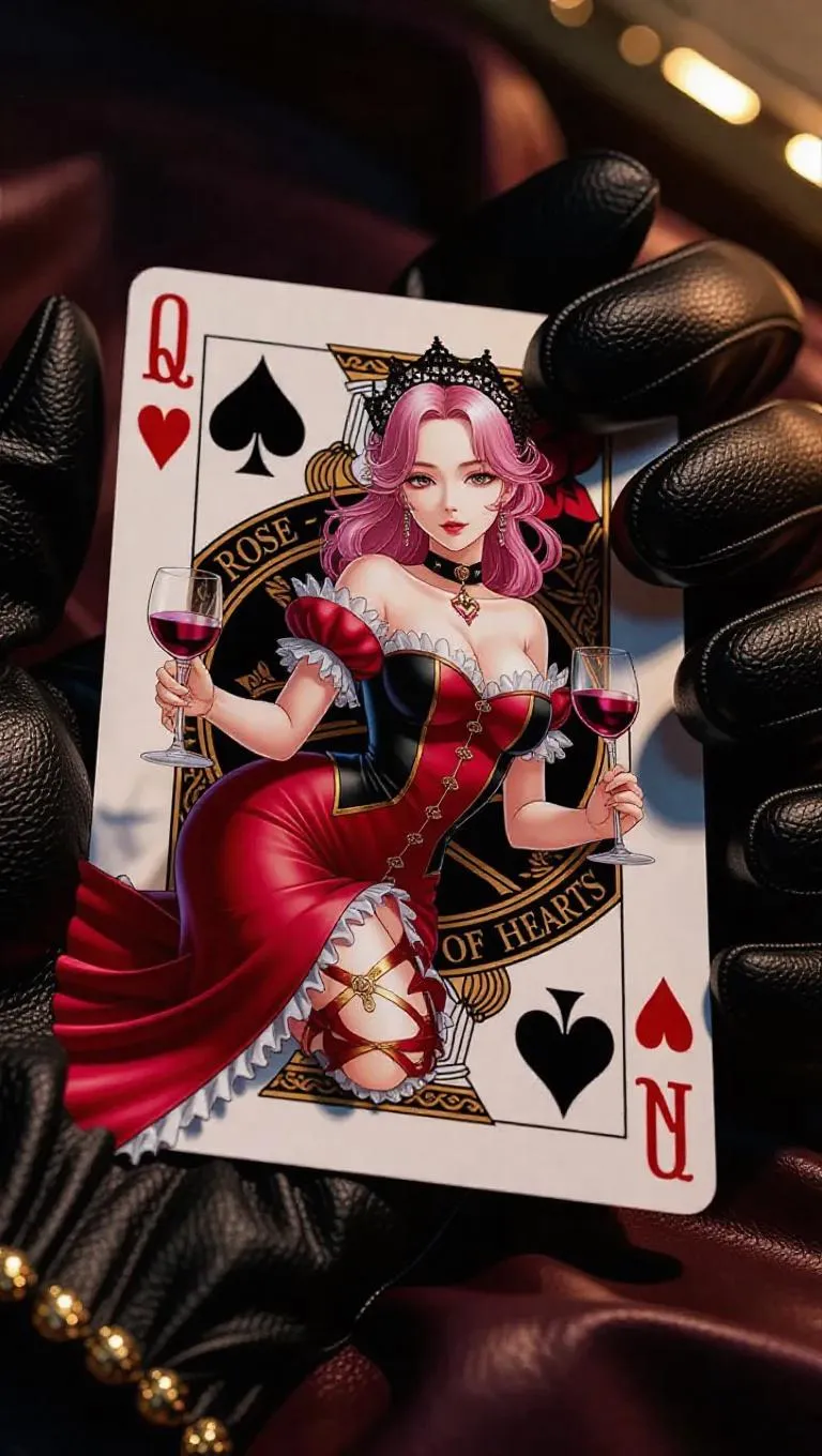 A glossy 3D anime playing card featuring Rosé (singer) as the Queen of Hearts, lying on an open black leather glove. The card showcases an anime-style portrait of Rosé in a red and black royal gown, holding a wine glass, with pink-blonde hair crowned in black lace. Hyper-detailed with golden frame edges, Q♥ symbols, and glowing "Rosé – Queen of Hearts" text. The glove has rich leather texture, light reflecting softly. Dark, blurred background for cinematic depth. Fantasy elegance, ultra-detail, high contrast, close-up shot.