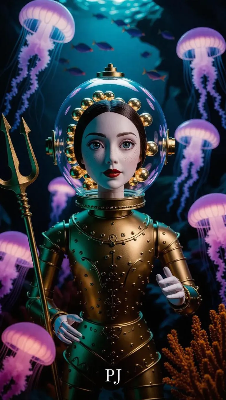 AI-generated surreal underwater scene featuring a marionette with glowing jellyfish, glass helmet, and metallic armor. Octane-rendered CGI with luminous colors, soft lighting, and realistic textures. Explore vivid marine fantasy with AI effects on vivago.ai.